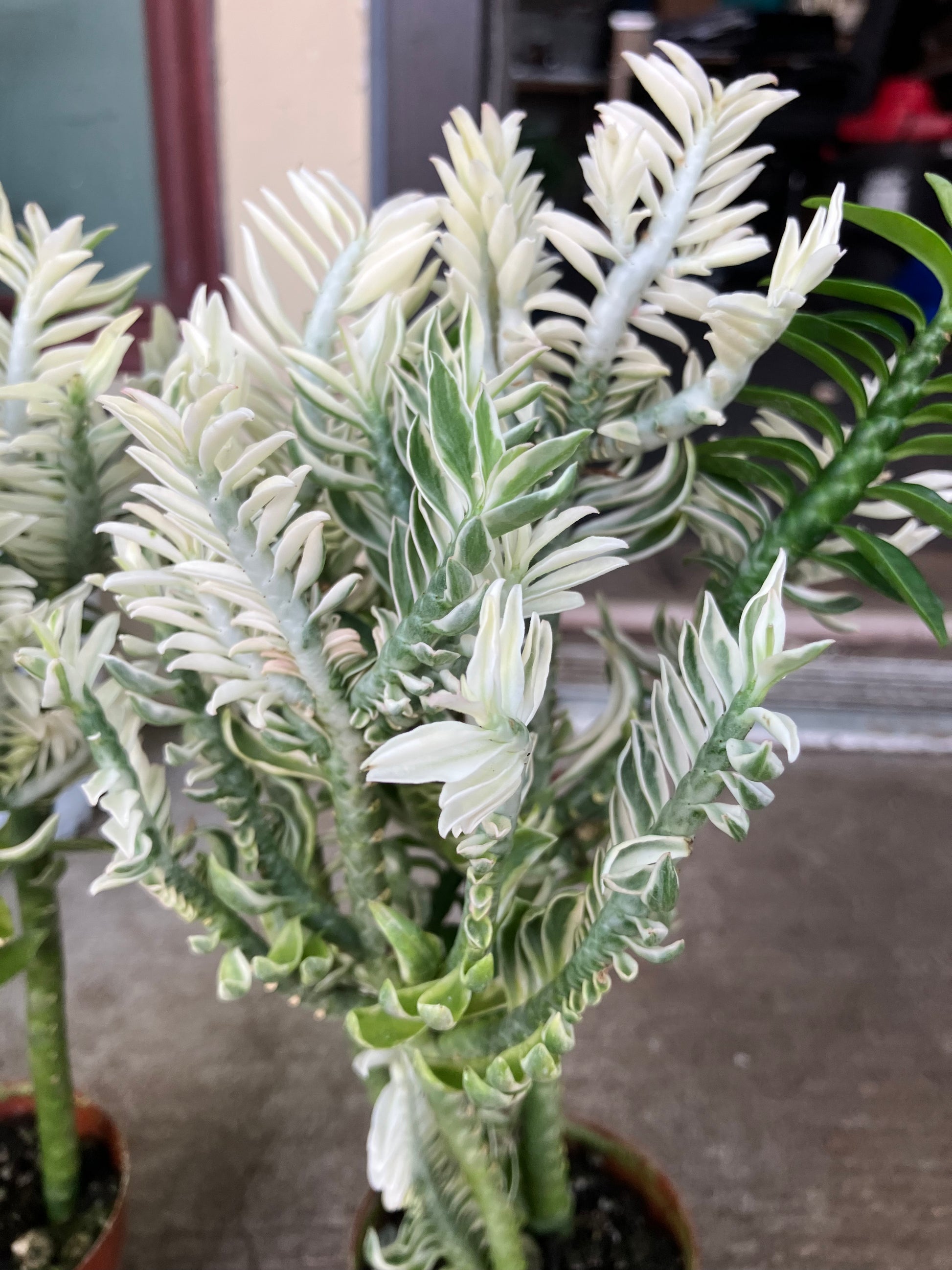 Leaves: It features small, lance-shaped leaves that can be green, variegated with white edges, and sometimes take on a reddish or pink tint in bright light or cool weather.